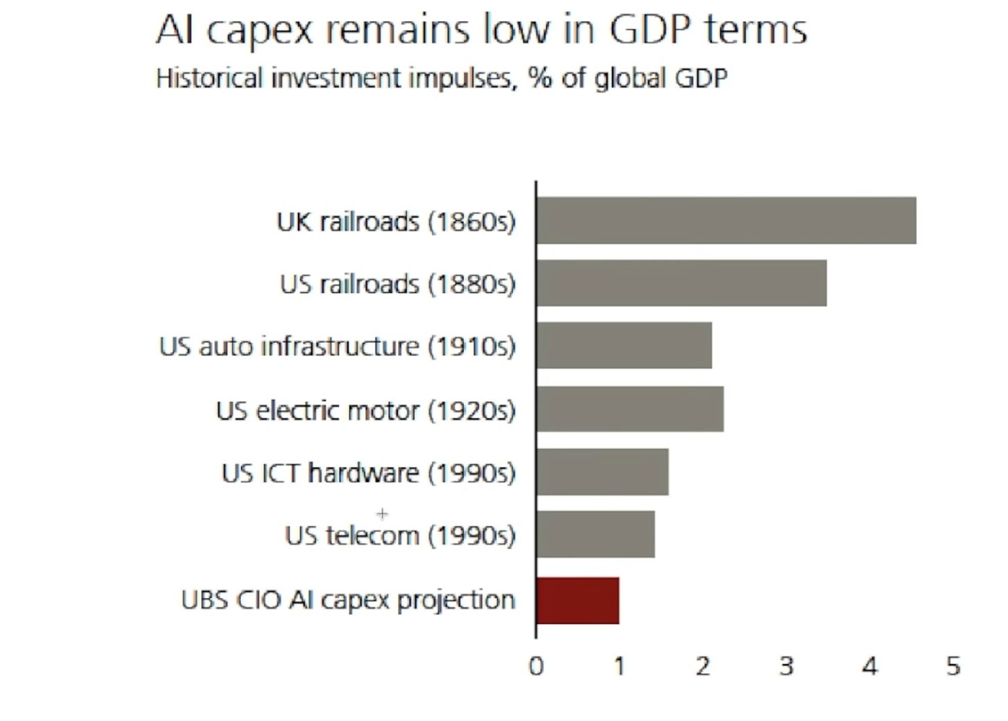 O capex em IA projetado pelo UBS ronda 1% do PIB, um valor relativamente pequeno no enquadramento macroeconómico.