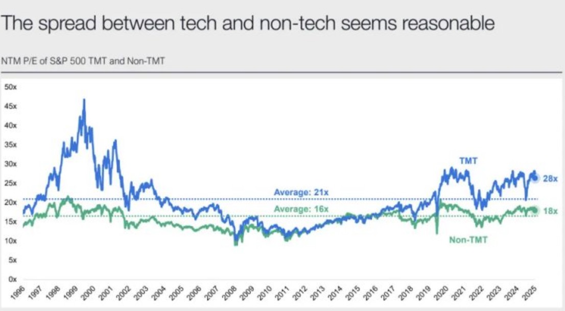Isto mostra que, embora o prémio atual da tecnologia seja acima da média, está muito longe da exuberância irracional dos anos 90.