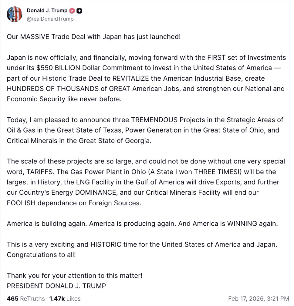 O acordo comercial entre os Estados Unidos e o Japão entrou oficialmente em vigor, com o início dos primeiros investimentos previstos no compromisso japonês de 550 biliões de dólares na economia norte-americana.