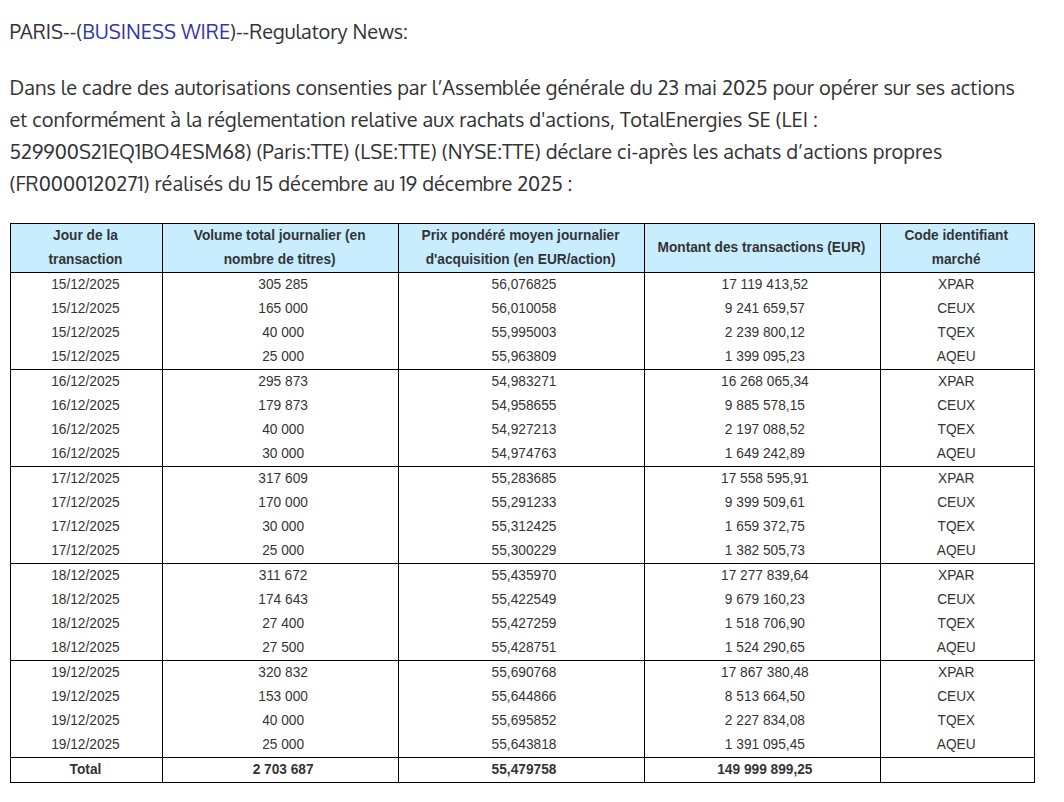 A TotalEnergies voltou a fazer compras significativas das suas próprias ações, realizadas entre 15 e 19 de dezembro de 2025, no âmbito das autorizações aprovadas pela assembleia geral e em linha com o programa de remuneração aos acionistas.