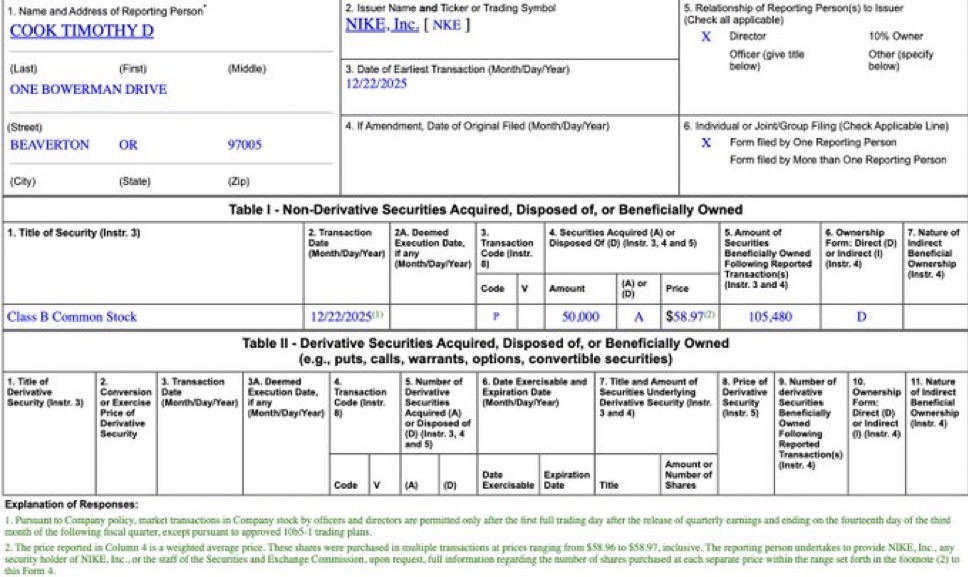 O CEO da Apple, Tim Cook, adquiriu 3 milhões de dólares em ações da Nike ($NKE) na terça-feira, comprando 50.000 ações a 58,97 dólares cada, reforçando a sua confiança no desempenho da gigante do vestuário desportivo.
