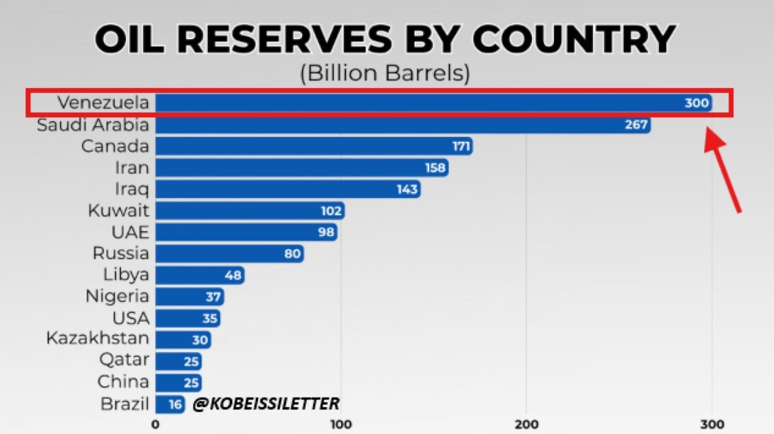 A Venezuela detém as maiores reservas comprovadas de petróleo bruto do mundo, estimadas em cerca de 303 mil milhões de barris, ultrapassando mesmo a Arábia Saudita. Com o petróleo cotado a cerca de US$ 57 por barril, o valor total destas reservas ascende a aproximadamente US$ 17,3 trilhões.