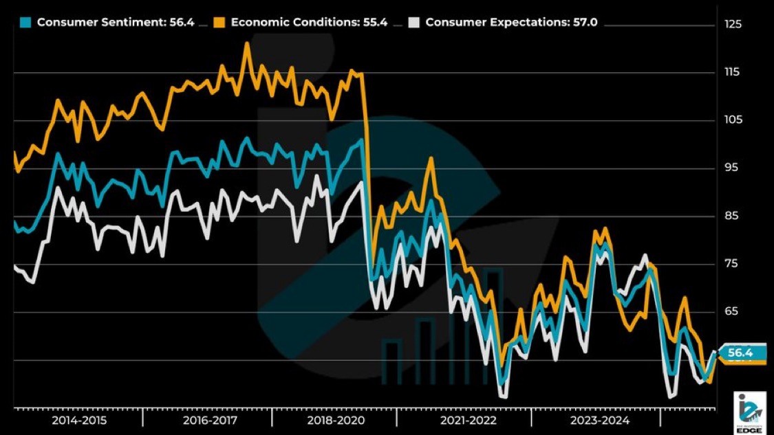 O índice geral de sentimento do consumidor subiu para 56,4 pontos, acima da estimativa de 54,0 e em linha com o valor do mês anterior. Este indicador mede a forma como os consumidores avaliam a sua situação financeira pessoal e as condições económicas do país, sendo frequentemente utilizado como um sinal antecipado do nível de consumo, que representa cerca de dois terços da economia dos EUA.