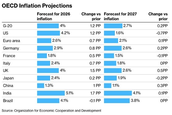 O impacto do conflito no Irão força a OCDE a rever em alta a inflação para 4,0% em 2026, enquanto o défice francês de -5,2% isola o país na Zona Euro.