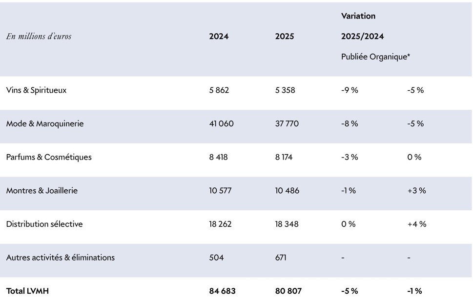 A LVMH, maior grupo mundial do setor do luxo, divulgou os resultados de 2025, registando uma descida de 5% nas vendas, para 80,8 mil milhões de euros, face aos 84,7 mil milhões alcançados em 2024. O resultado líquido recuou 9%, refletindo o impacto de flutuações cambiais e de um ambiente de consumo mais fraco nos principais mercados.
