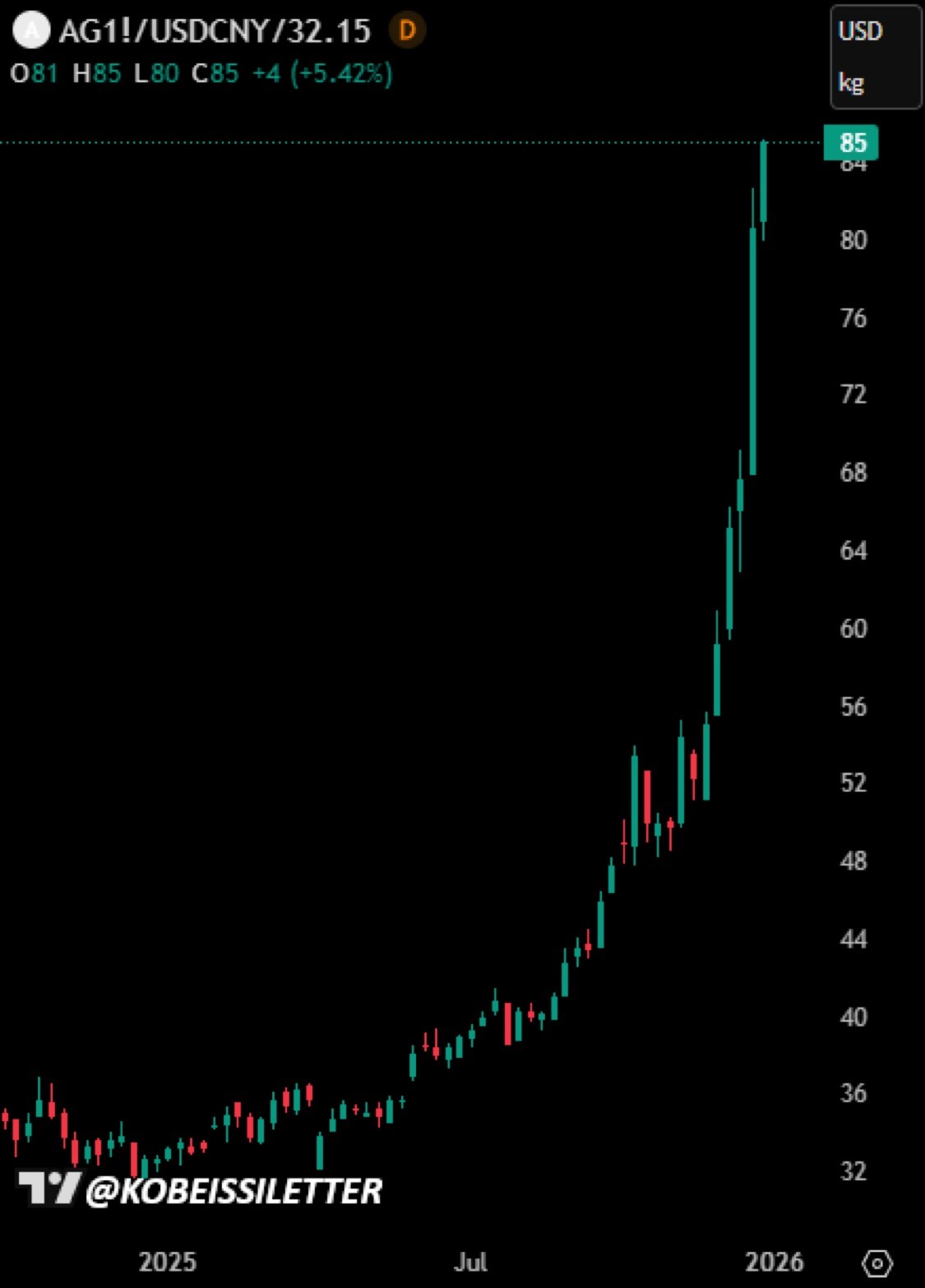O preço da prata em Xangai atingiu cerca de 85 dólares por onça, cerca de 5 dólares acima dos preços spot nos EUA, refletindo a escassez física global.Em 2025, a prata registou uma subida de 175%, com tendência de continuidade e oito meses consecutivos de alta, um fenómeno não visto desde 1980.