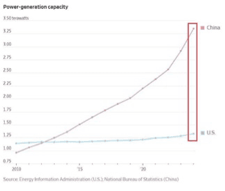 A China domina claramente a corrida pela “superpotência energética”. Nos últimos 12 meses, o país acrescentou cerca de 500 TWh de geração elétrica, um aumento cinco vezes superior ao dos EUA, e o grosso desse crescimento veio da energia solar e eólica, não do carvão.
