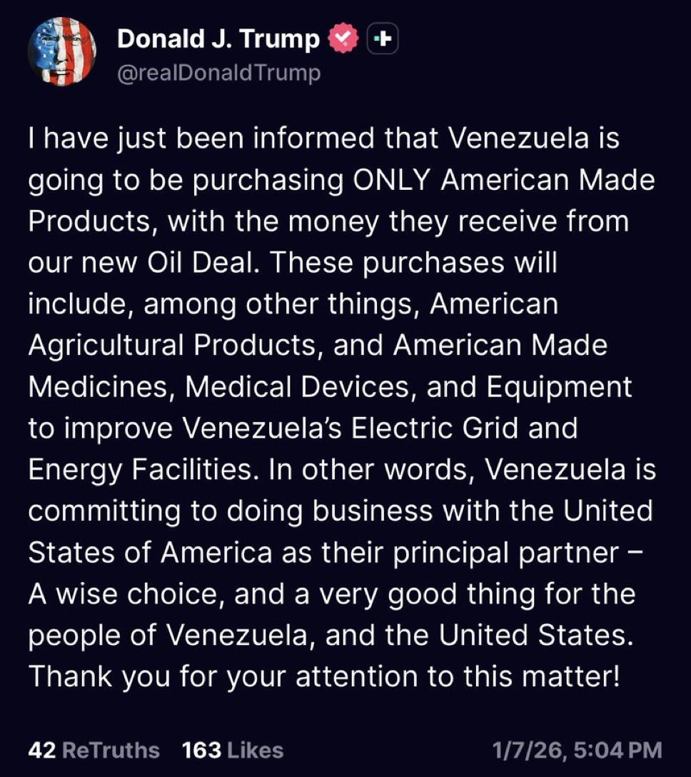 “A Venezuela COMPRARÁ SOMENTE produtos fabricados nos Estados Unidos com o dinheiro que receber do nosso novo acordo petrolífero. Estas compras incluirão, entre outras coisas, produtos agrícolas americanos, medicamentos, dispositivos médicos e equipamento para melhorar a rede eléctrica e instalações energéticas da Venezuela. Em outras palavras, a Venezuela está a comprometer-se a fazer negócios com os Estados Unidos como principal parceiro, uma escolha sensata, e muito boa tanto para o povo da Venezuela como para os Estados Unidos.”