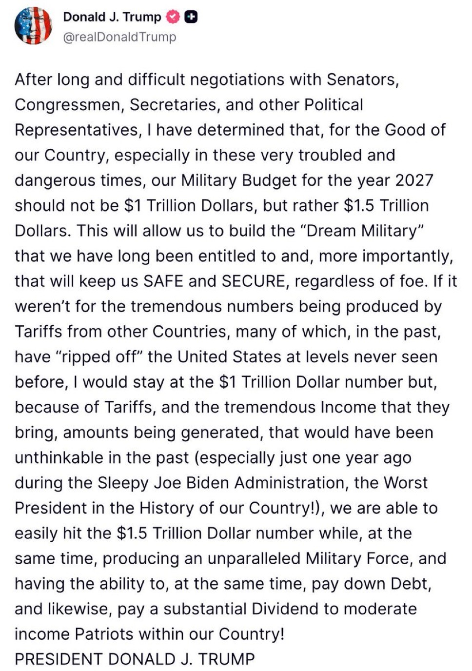 Para além das medidas comerciais, Trump propôs um orçamento militar reforçado para o ano fiscal de 2027, passando dos cerca de US$ 1 trilhões inicialmente planeados para US$ 1,5 trilhões.
