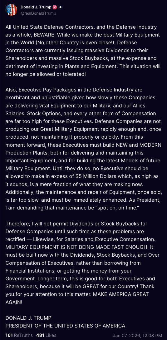 Trump afirmou também que dividendos e recompras de ações (stock buybacks) estão proibidos até que as empresas “retifiquem” os problemas existentes na produção. Segundo ele, a medida pretende pressionar as companhias de defesa a investir em capacidade industrial e modernização, em vez de recompensar excessivamente os executivos ou redistribuir lucros aos acionistas.